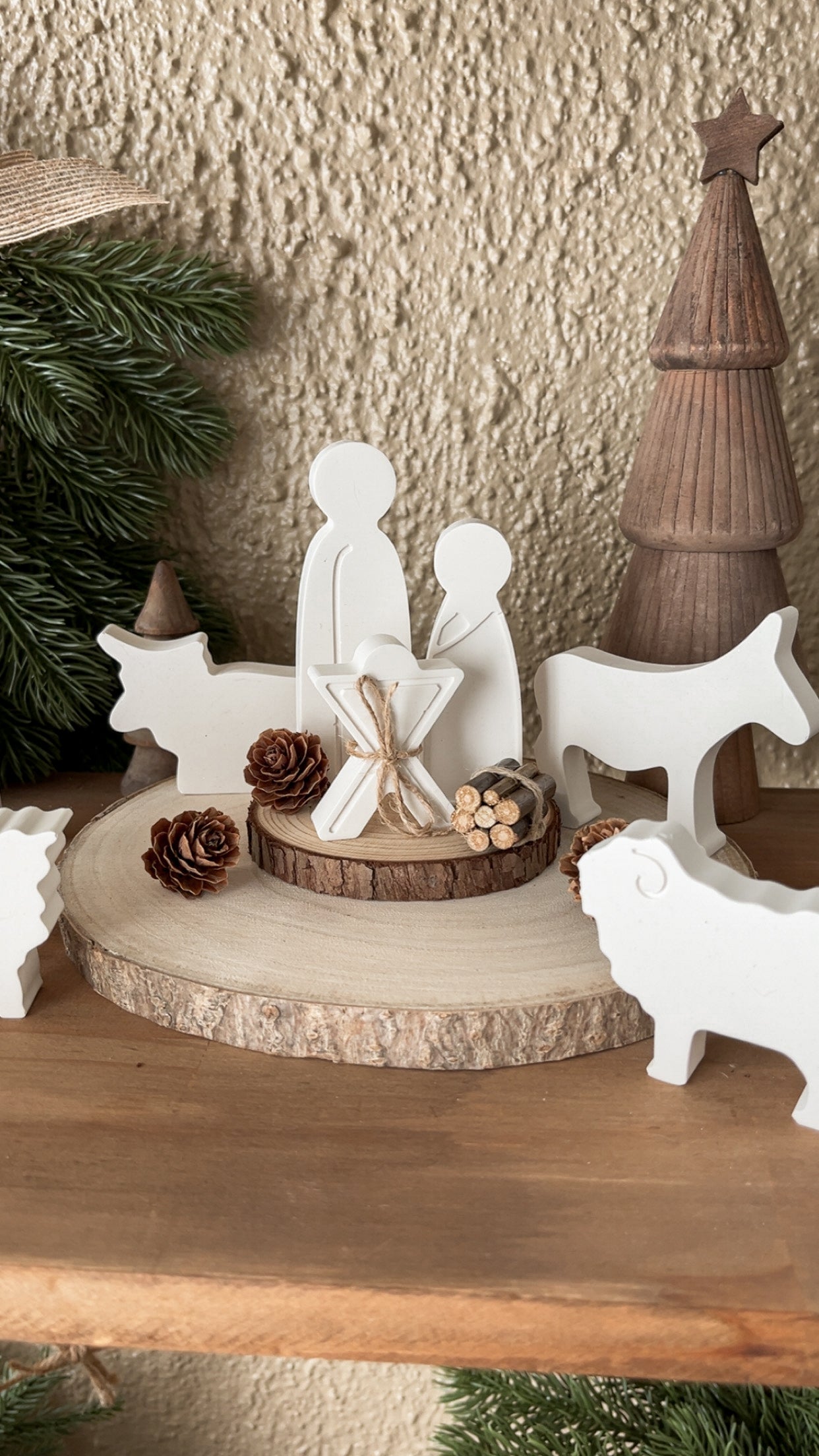 - Ensemble complet de 10 santons, 2 rondins de bois, pommes de pin et guirlande lumineuse.
